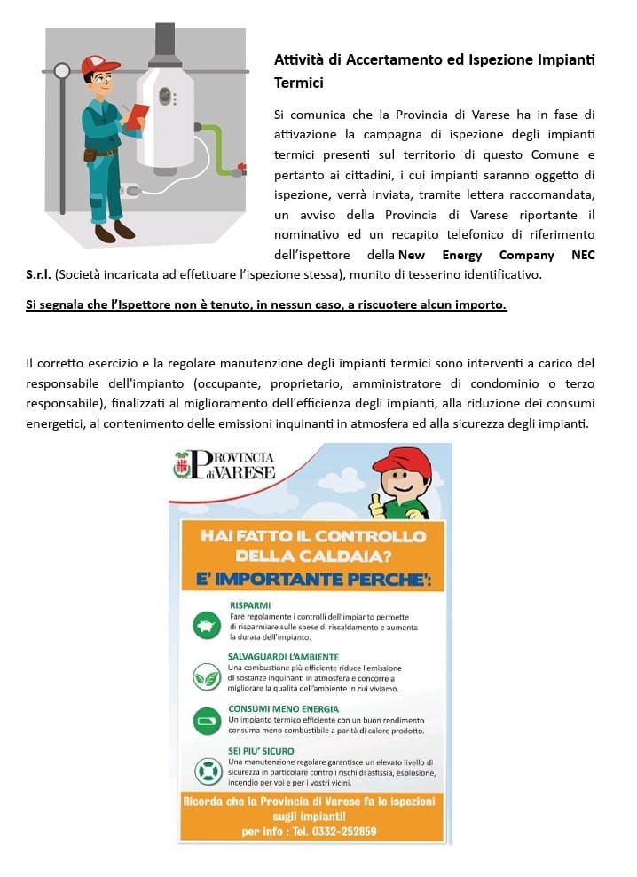 Si comunica che la Provincia di Varese ha in fase di attivazione la campagna di ispezione degli impianti termici presenti sul territorio del Comune e pertanto ai cittadini, i cui impianti saranno oggetto di ispezione, verrà inviata, tramite lettera raccomandata, un avviso della Provincia di Varese riportante il nominativo ed un recapito telefonico di riferimento dell’ispettore della New Energy Company NEC S.r.l. (Società incaricata ad effettuare l’ispezione stessa), munito di tesserino identificativo.